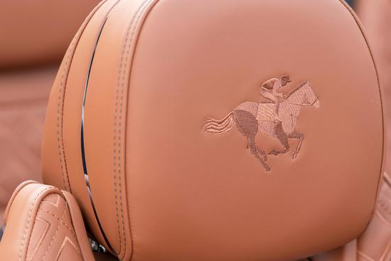 內飾方面,新車艙內的墨綠(Cumbrian Green)配色設計在座椅、飾板等採用馬鞍棕(Saddle)配色,並精心飾以專屬馬術徽標,門板內襯使用的是粗花面料,同時還在頭枕上縫製了馬術的LOGO,核桃木的飾板上也有燙金的馬術紋飾,以彰顯該車型的馬術特徵。